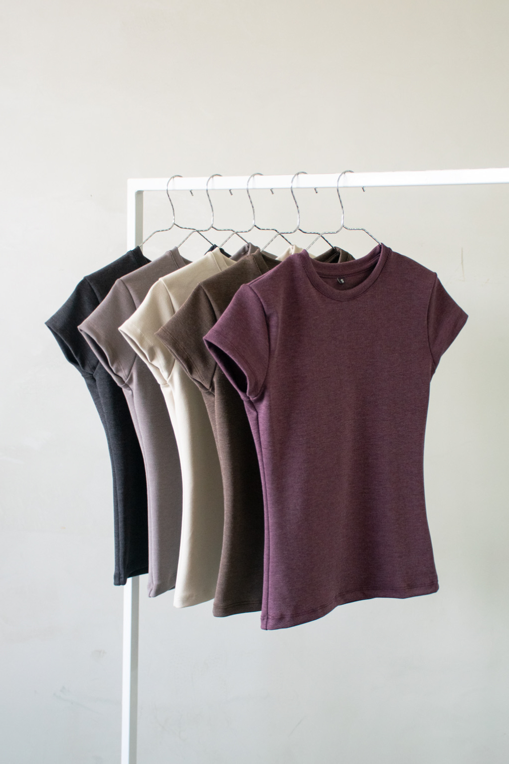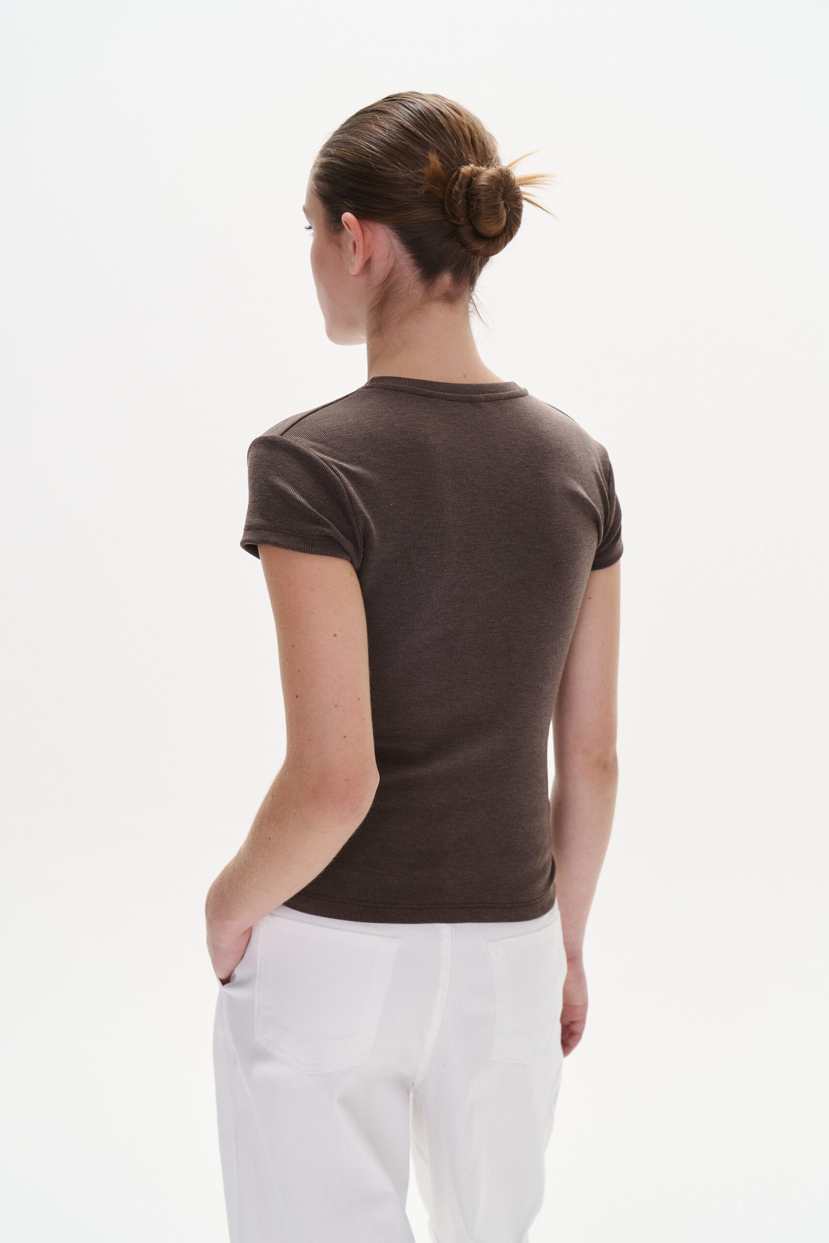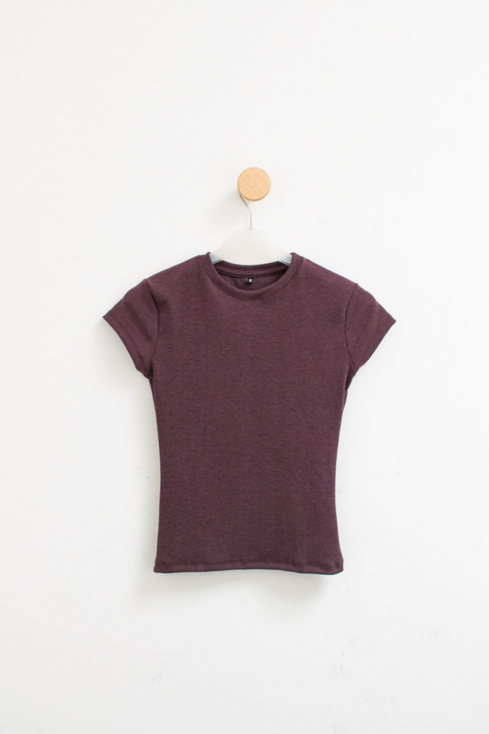 Remera bitono de algodón con lycra con cuello redondo y mangas cortas japonesas, largo hasta la cadera.