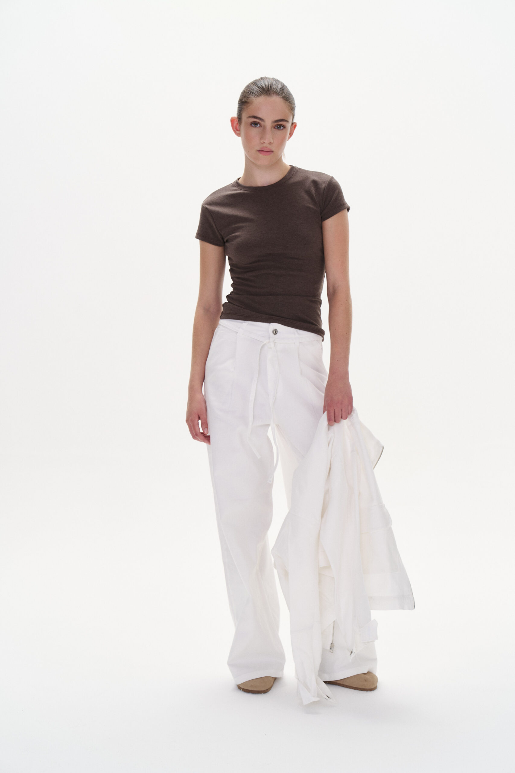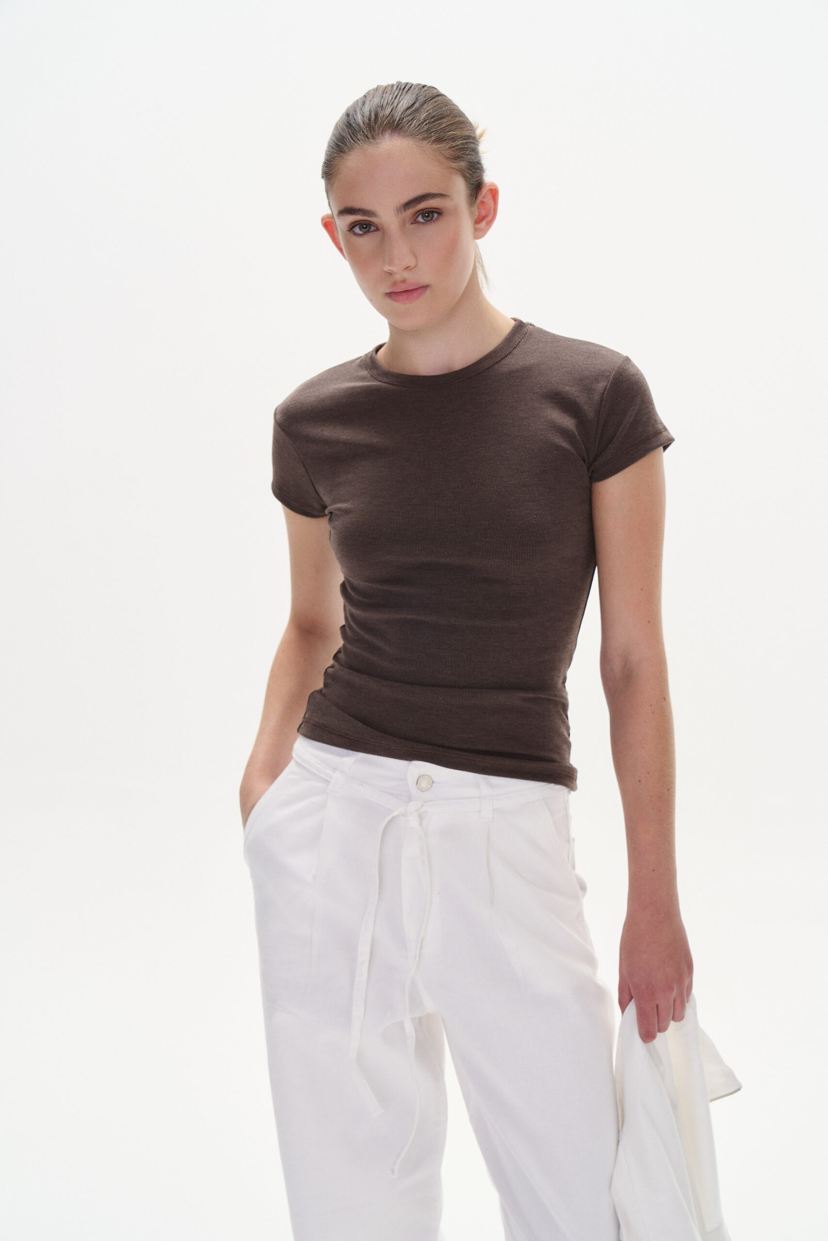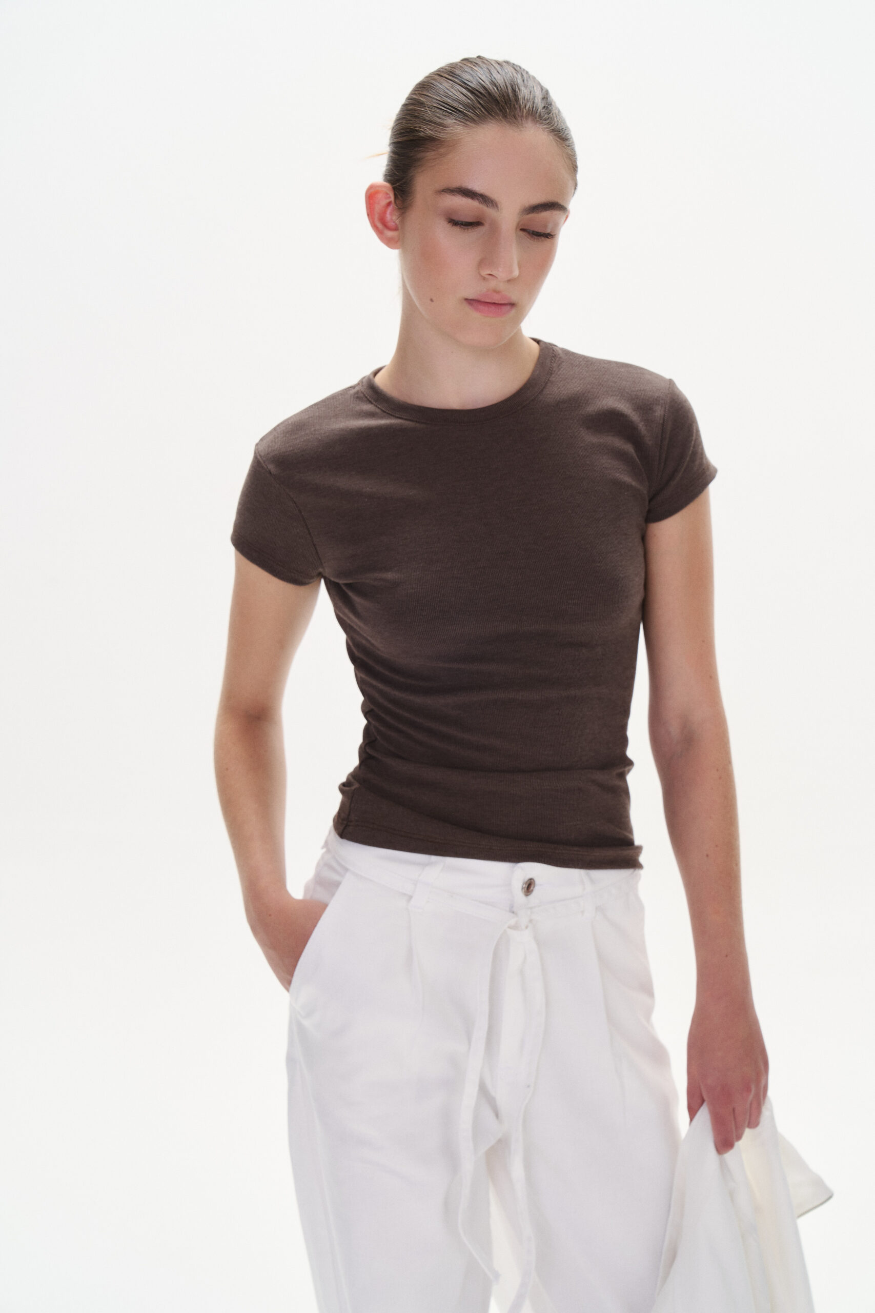 Remera bitono de algodón con lycra con cuello redondo y mangas cortas japonesas, largo hasta la cadera.