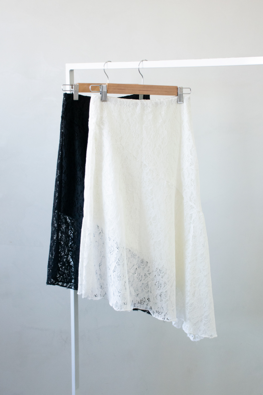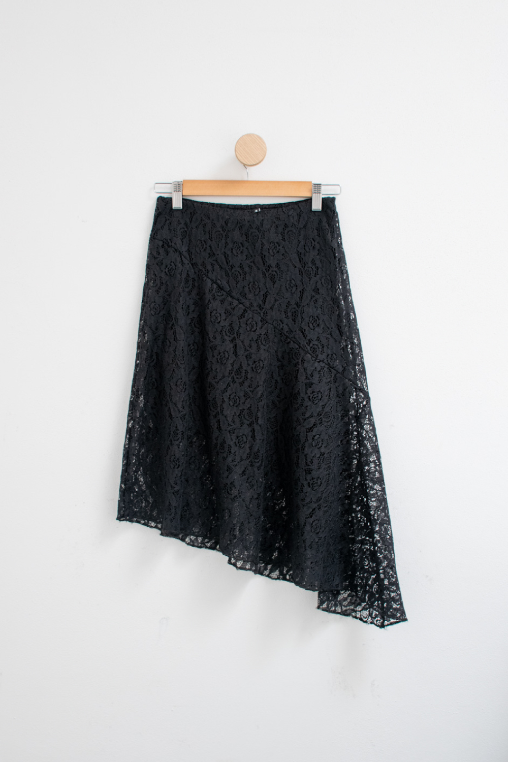 Pollera de encaje con elástico en la cintura y forro interno. Detalle de vuelo y bajo asimetrico.