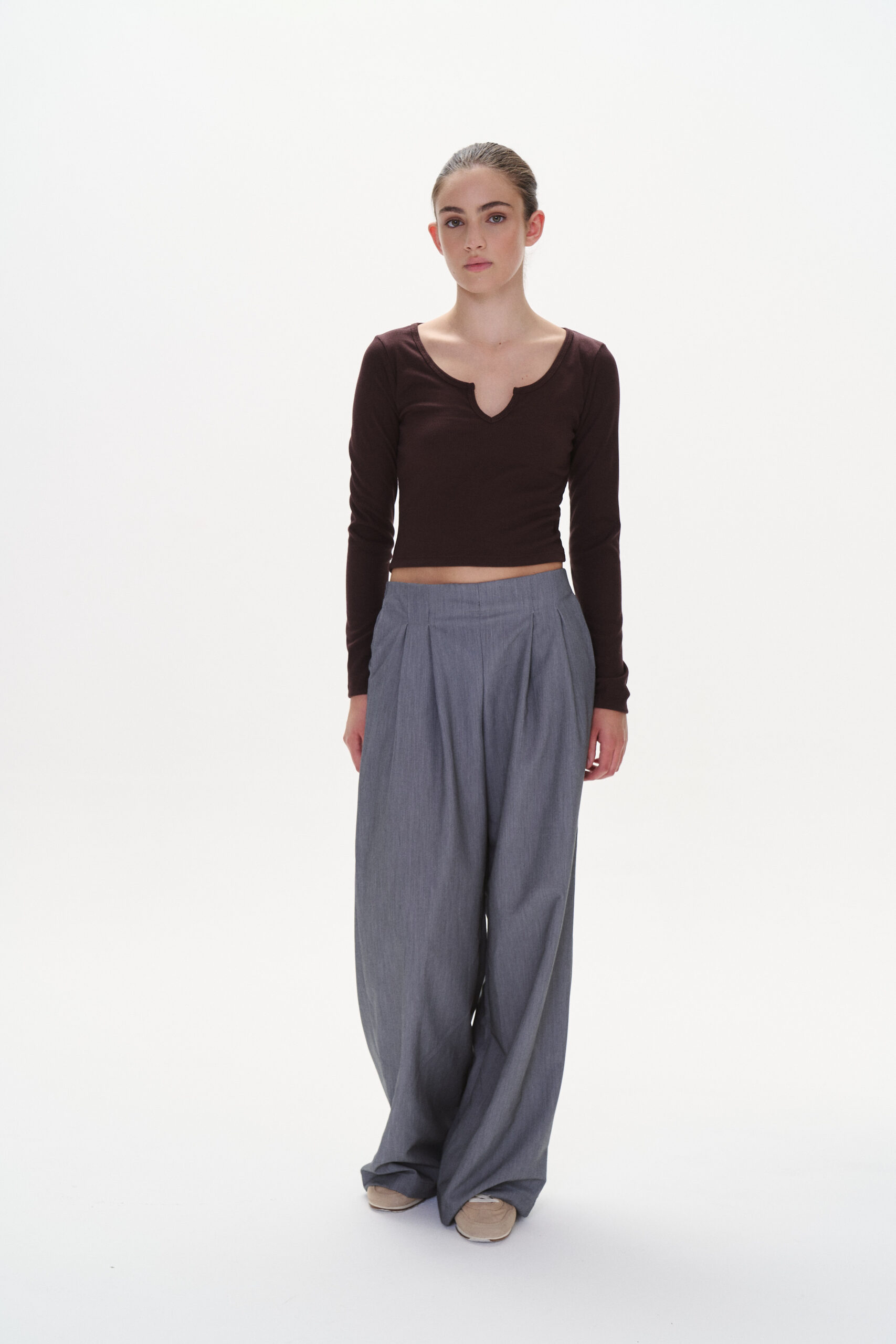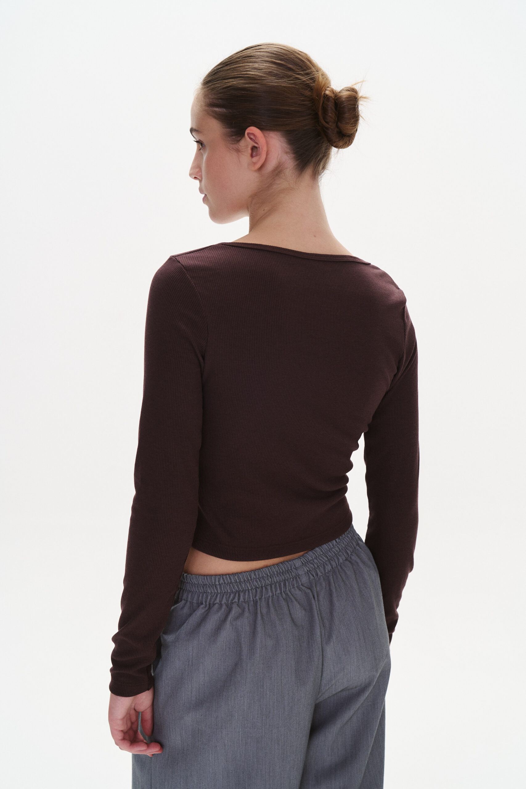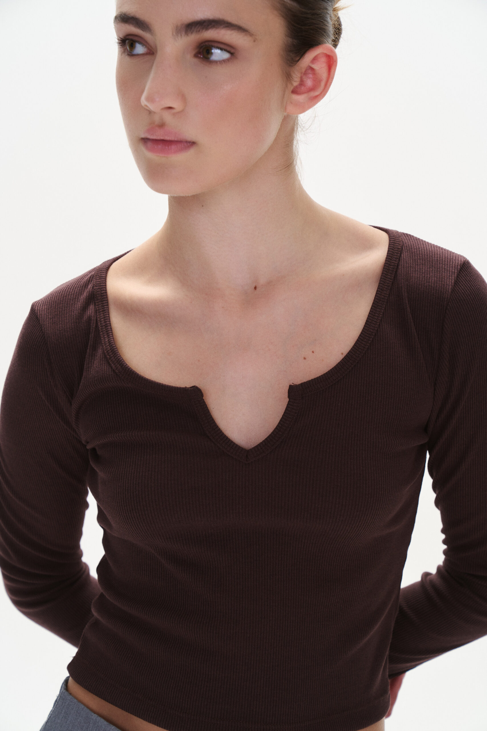 Remera de morley con mangas largas y pequeño escote V en el delantero.