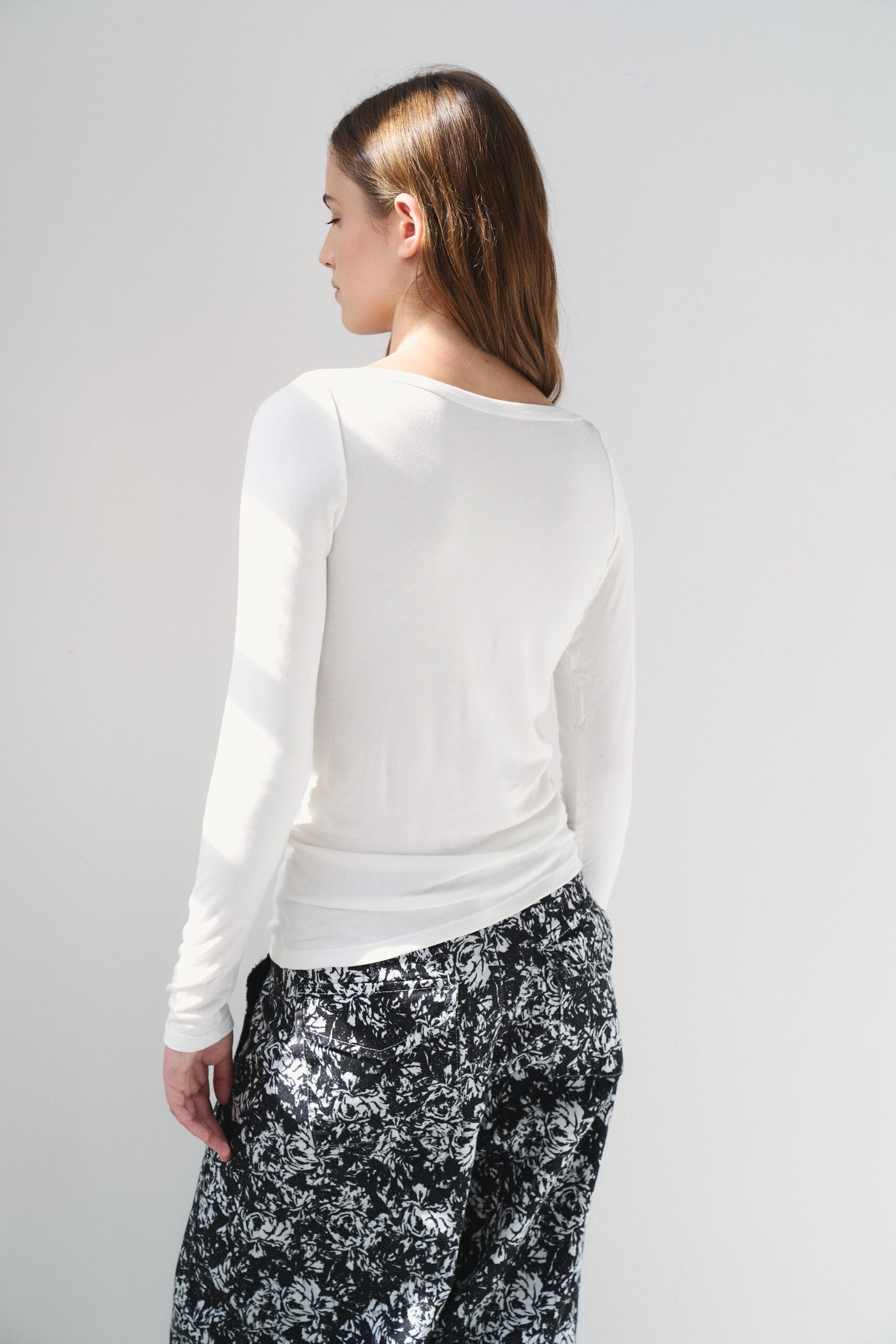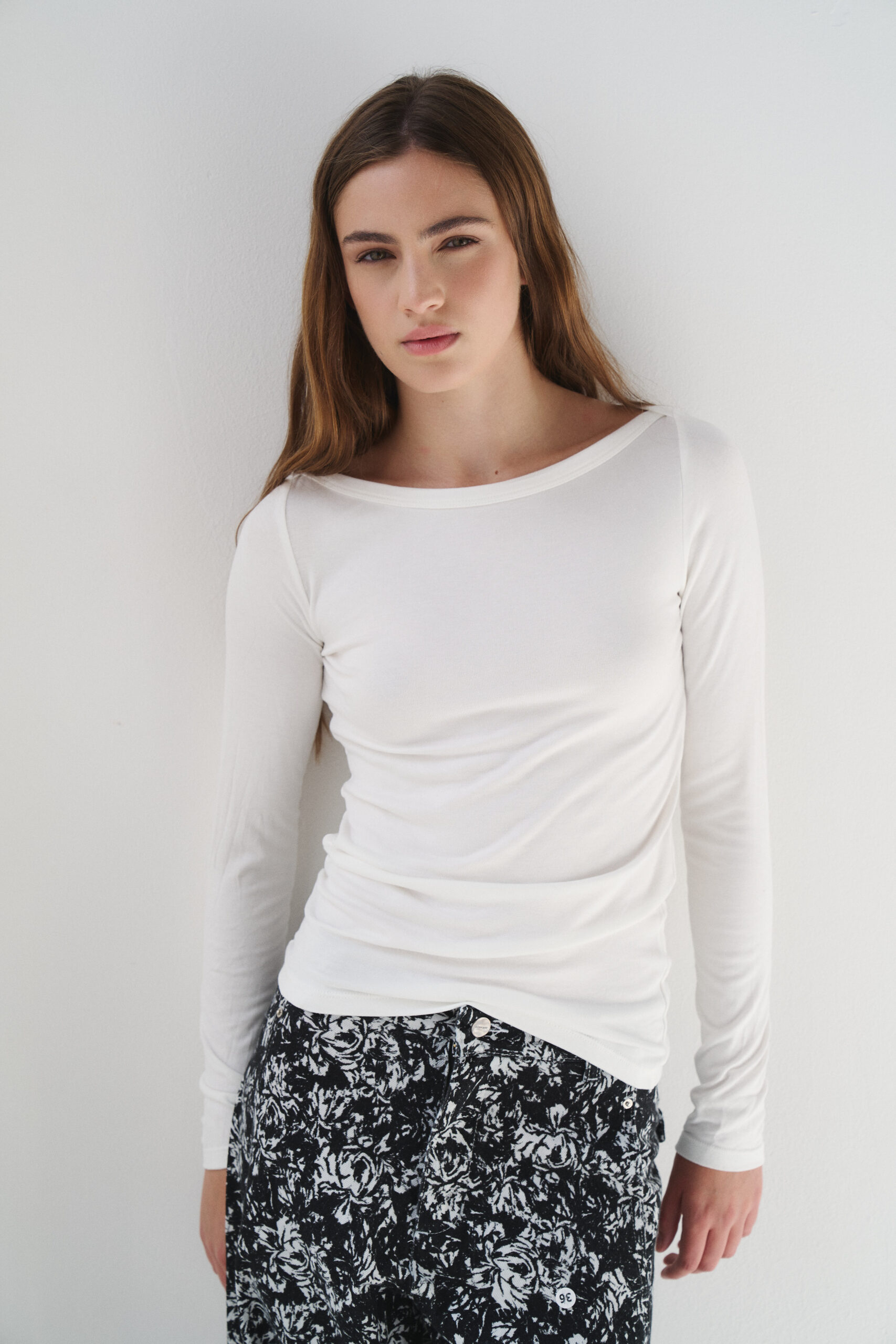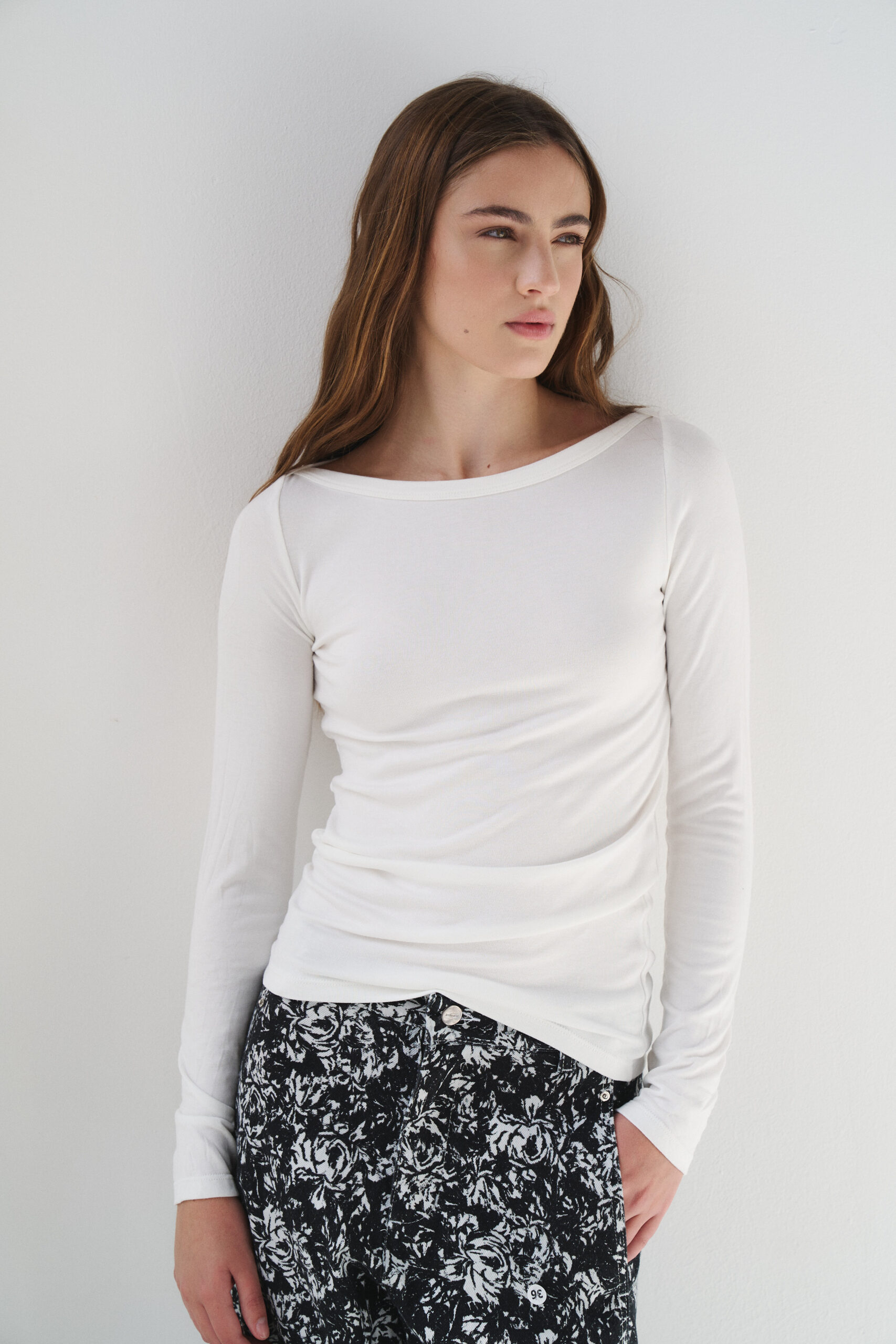 Remera manga larga en suave ribb viscosa. Modelo con cuello bote, cruzado en hombros y collareta ancha.
