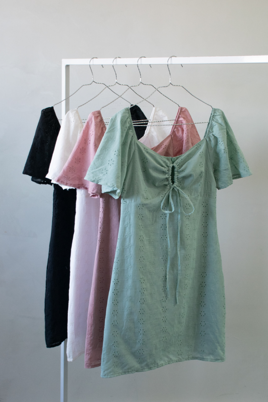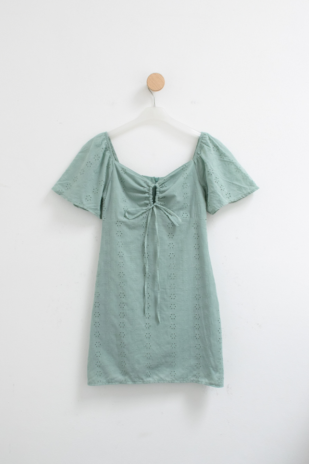 Vestido entallado de broderie con forro interno al tono. Modelo con elastico en los hombros y cinto regulable en el escote.