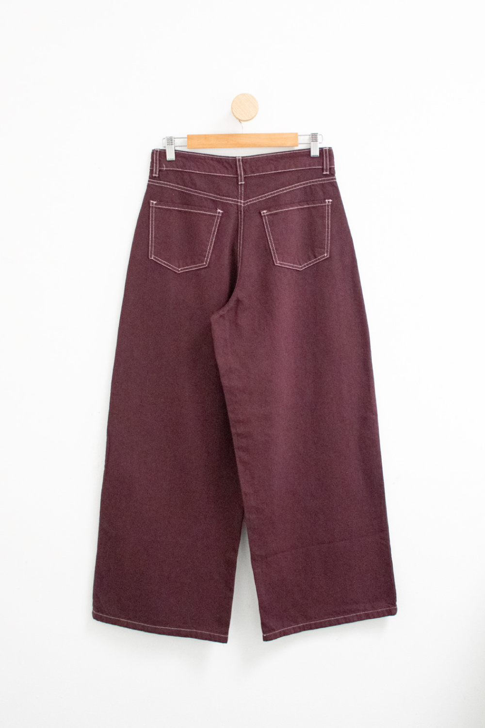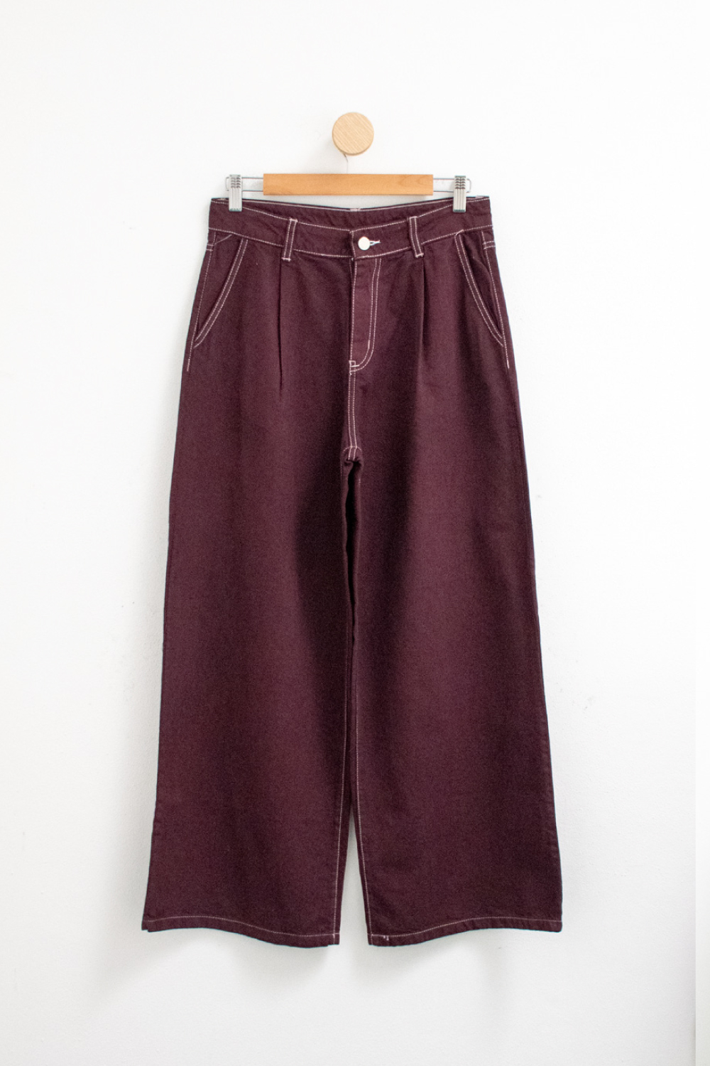Pantalón wide leg con pinzas en el delantero en denim. Modelo con bolsillos delanteros.