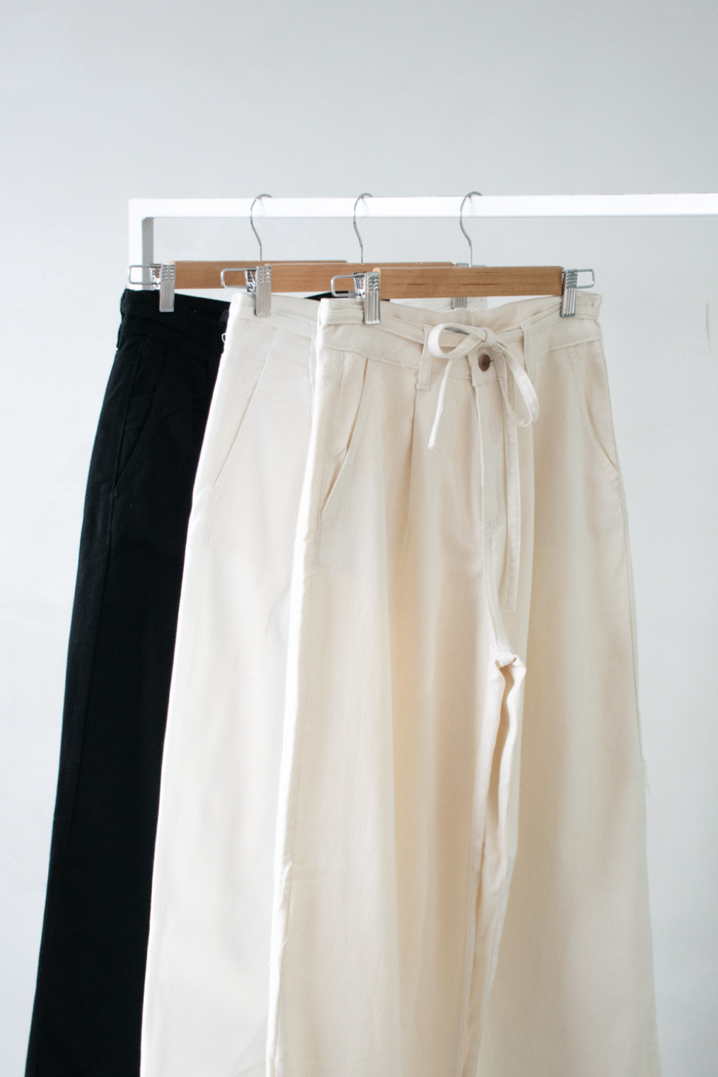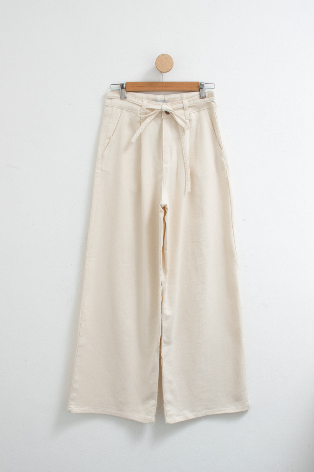 Pantalón wide leg con pinzas en el delantero en bull sastrero. Modelo con bolsillos delanteros y cinto decorativo en la cintura.