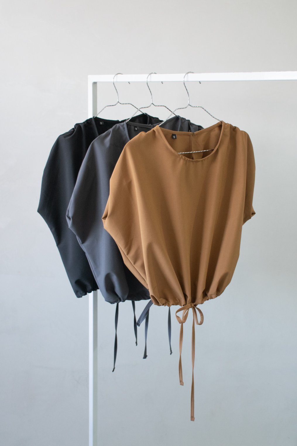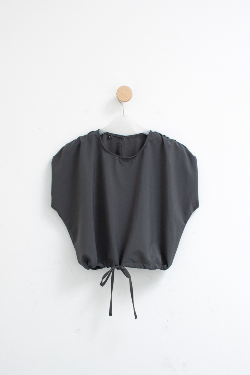 Musculosa oversize en tejido plano tipo parachute con cuello redondo y frunce en hombros. Detalle de cinto regulable en el bajo y cierre de prenda con botón en la espalda.