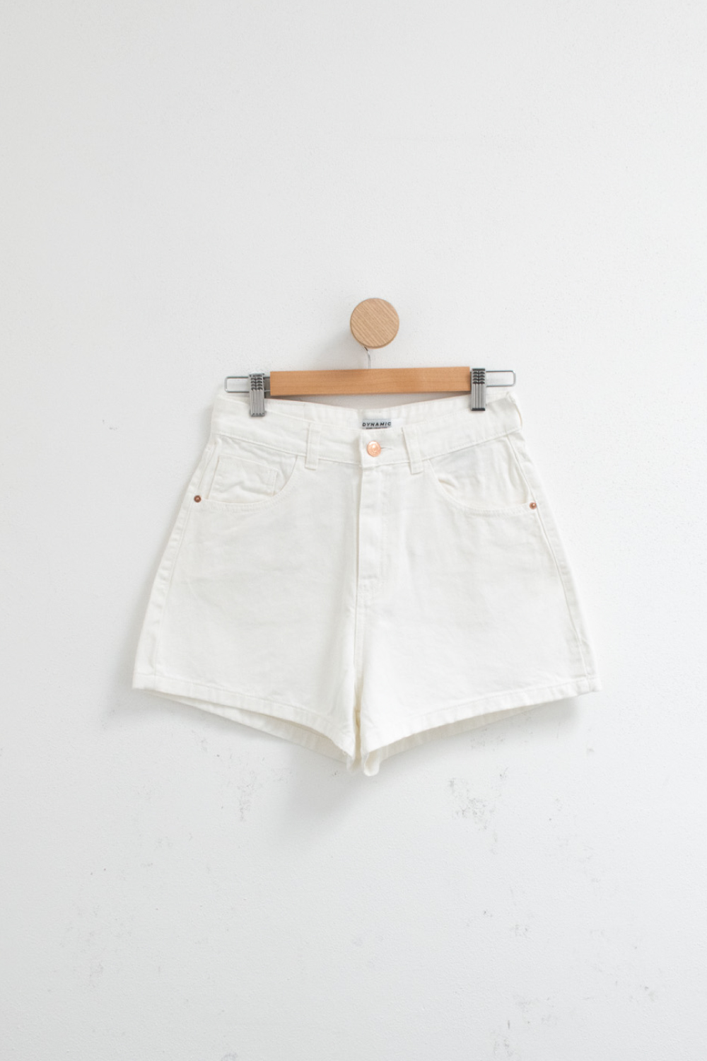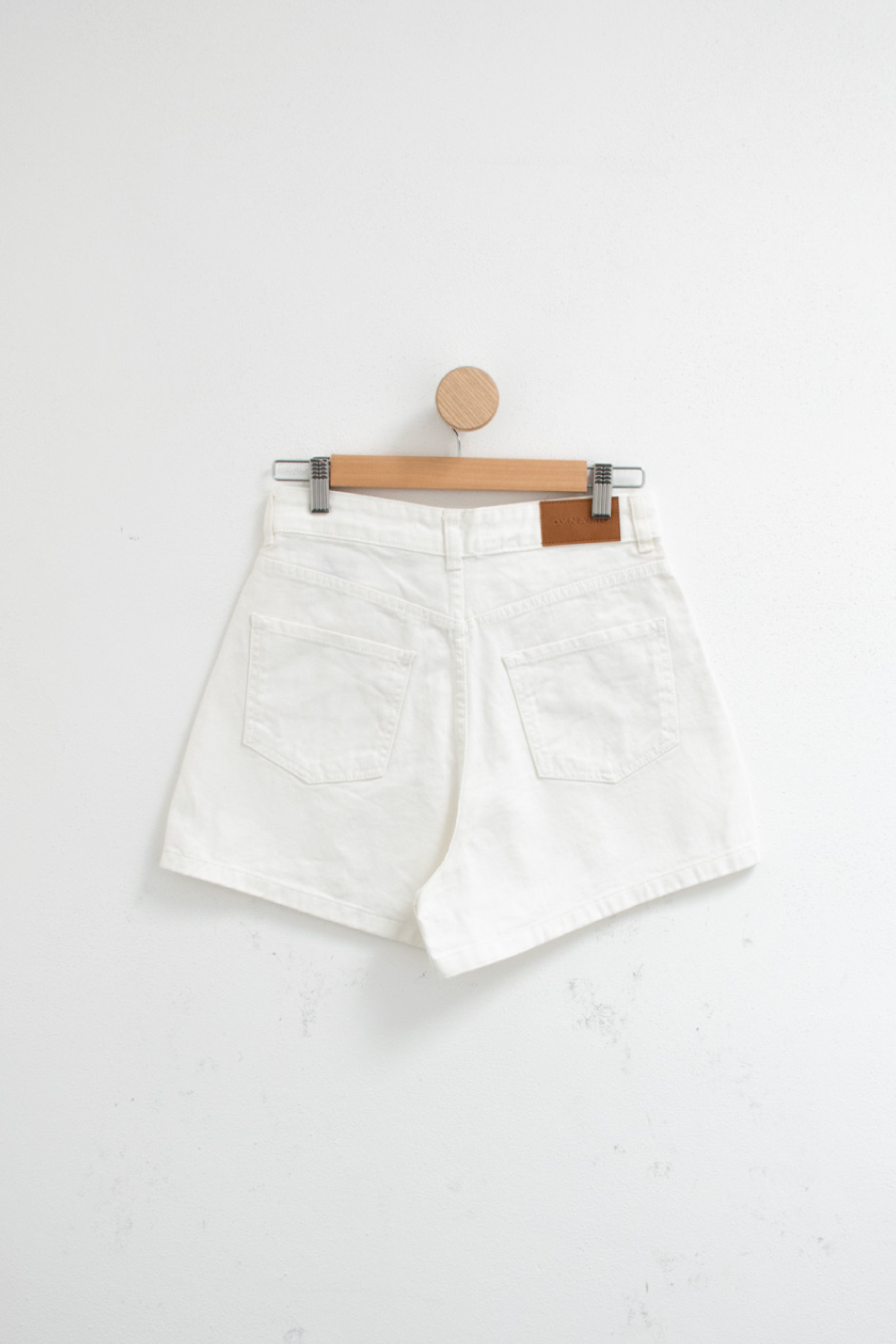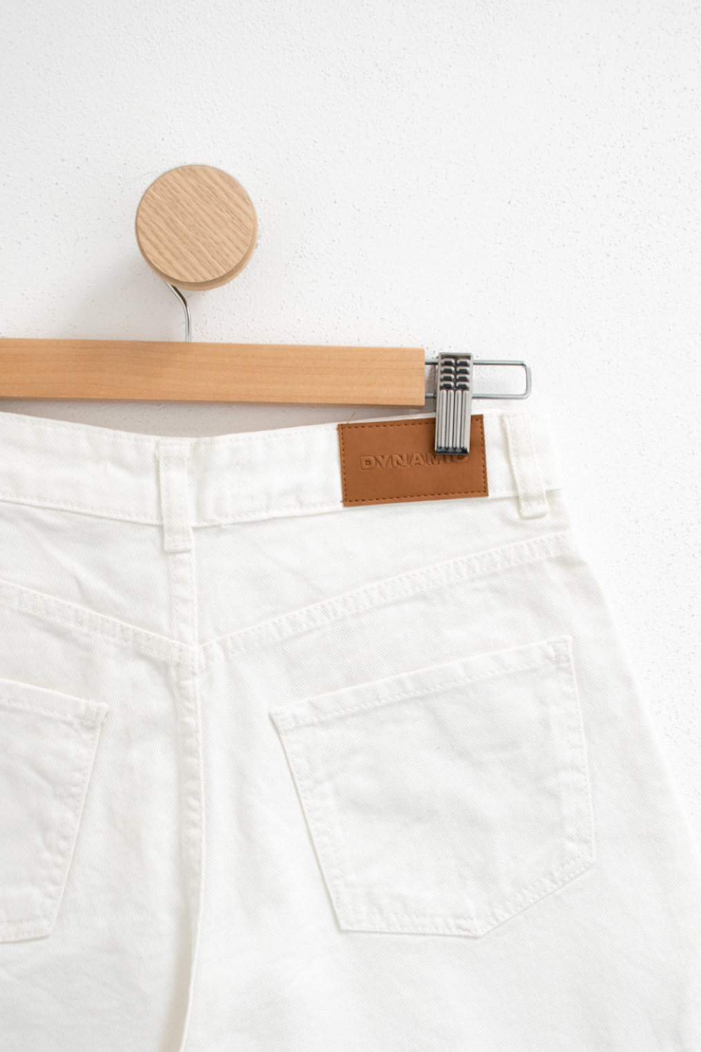 Short de jean rígido de tiro alto. Modelo con corte mom fit y cinco bolsillos. Lavado Crudo.