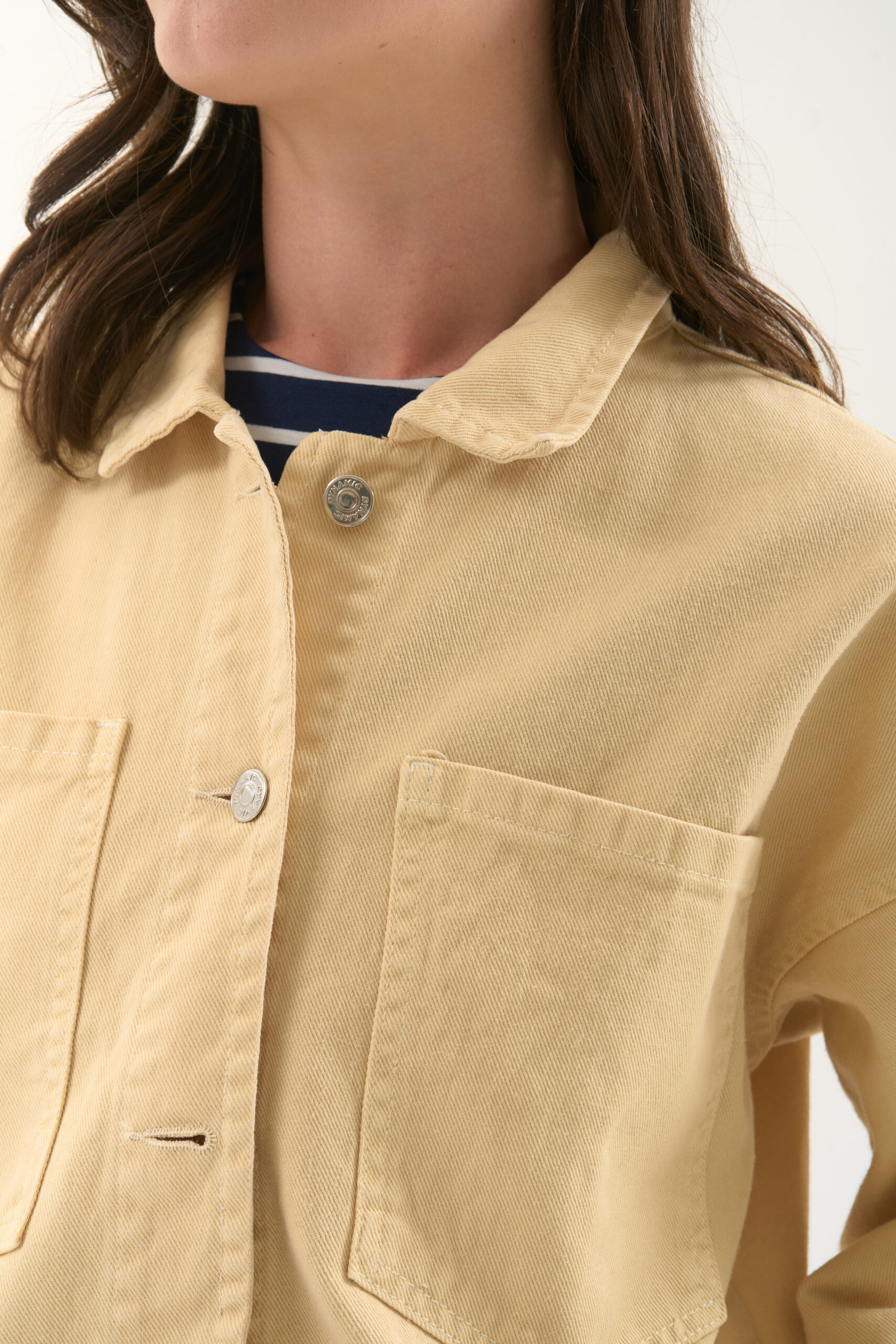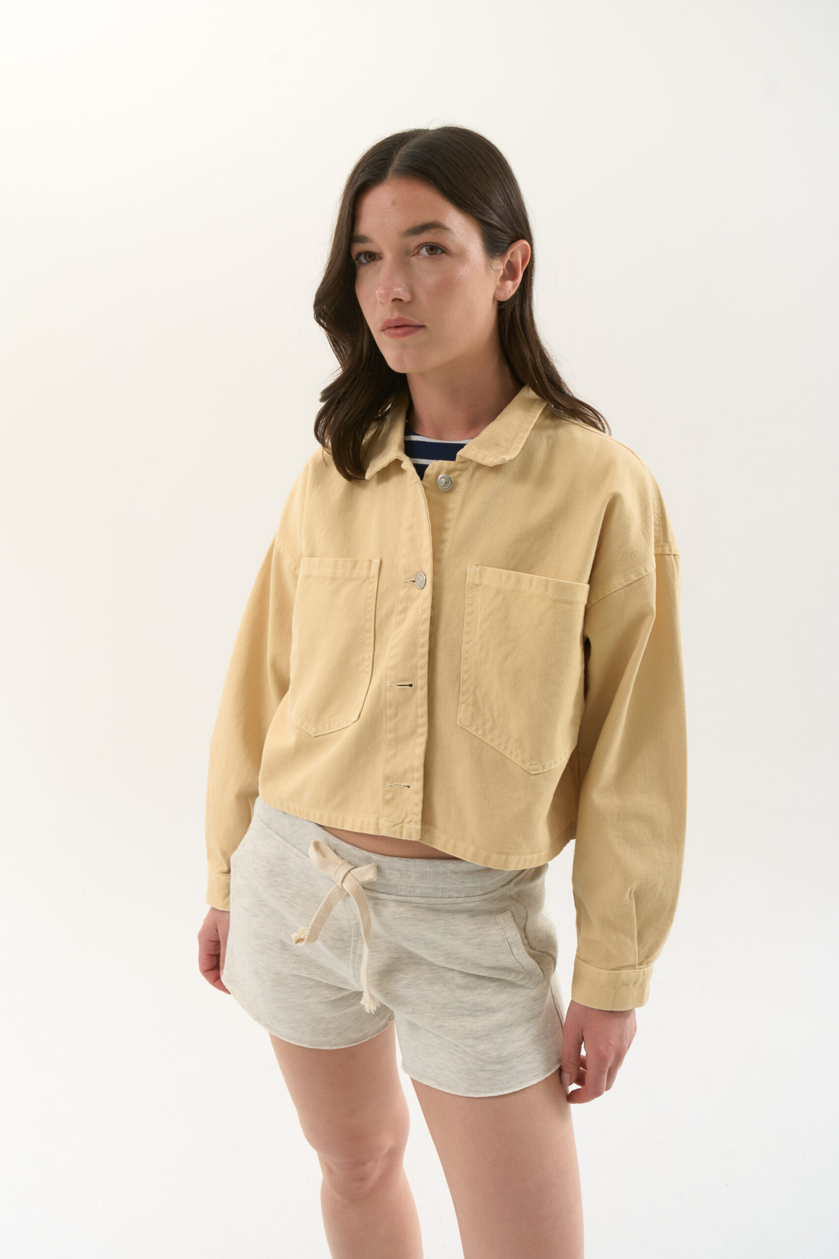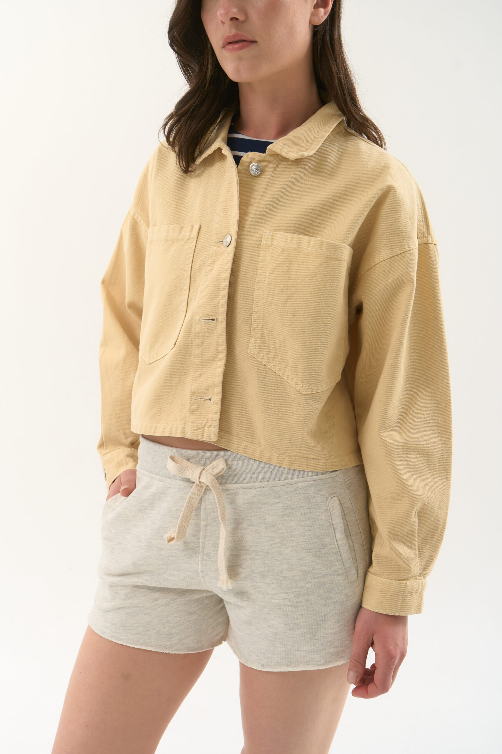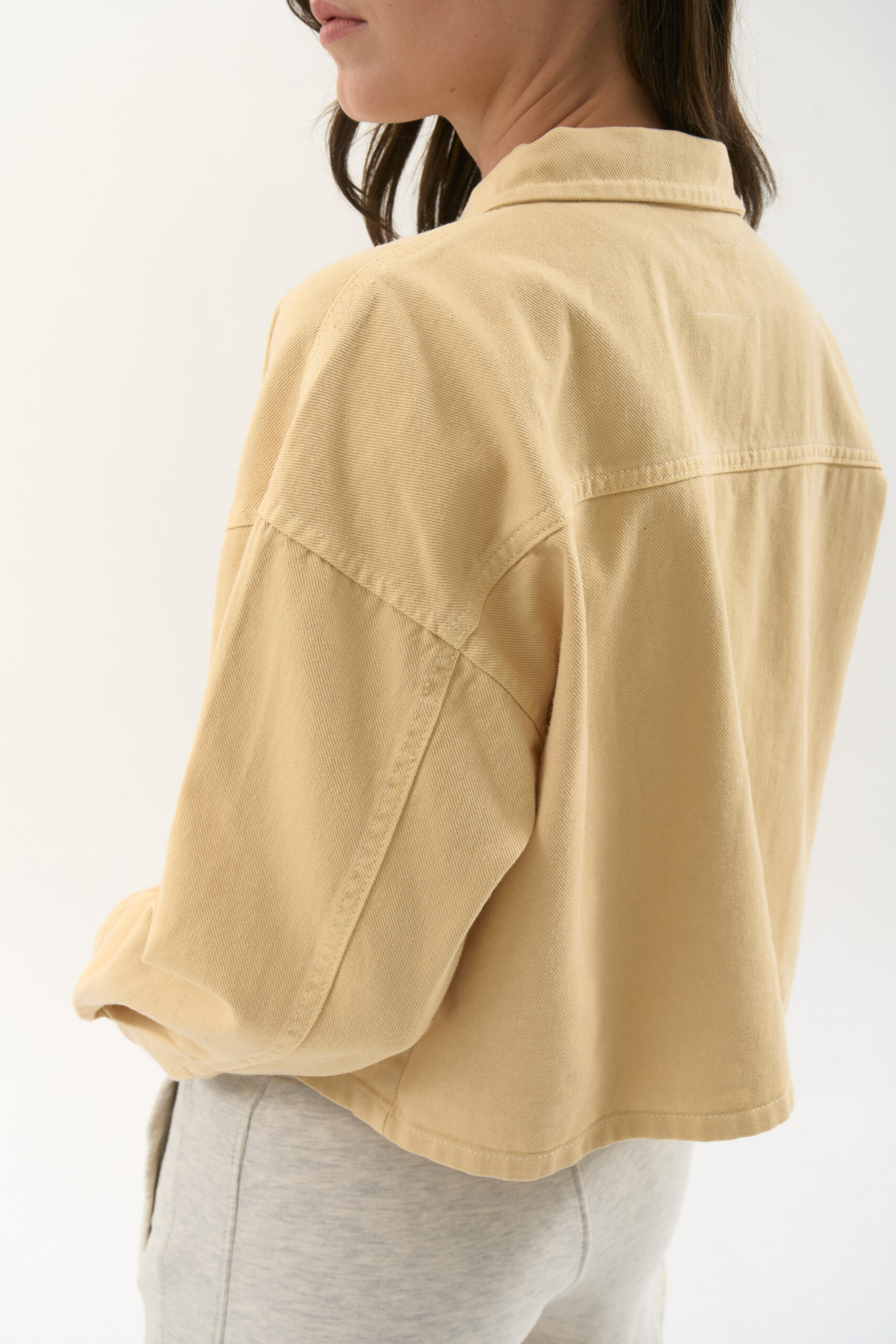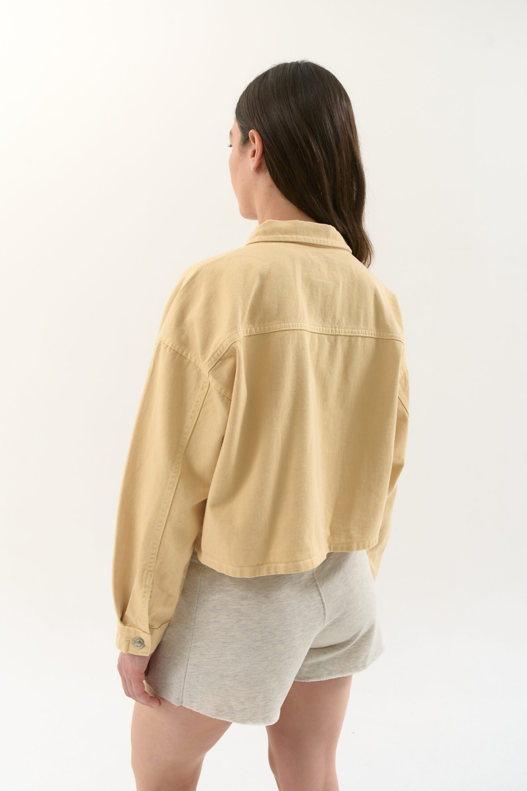 Campera crop de Jean con bolsillos delanteros. Modelo oversized con hombros caídos.
